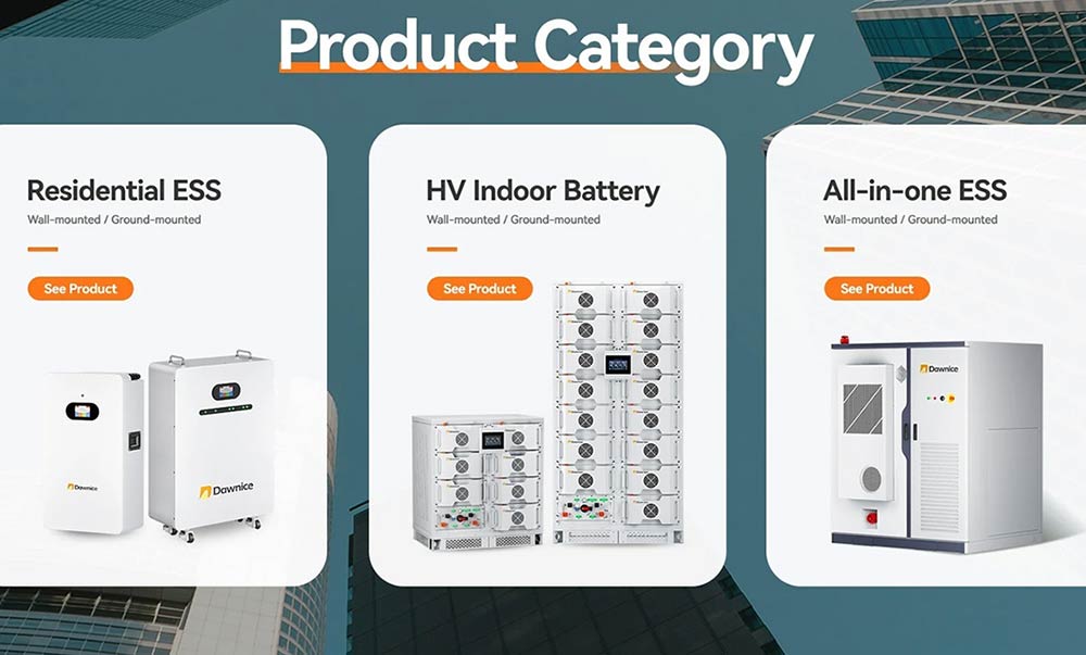 محصولات اصلی داونیس شامل سری باتریهای خانگی (wall-mounted، stackable و rack-mounted) با ظرفیتهای ۵ تا ۲۰ کیلوواتساعت (مانند مدلهای ۵.۱۲kWh ۴۸V، ۱۰kWh، ۱۵kWh و بالاتر) و سیستمهای ذخیرهسازی تجاری و صنعتی بزرگمقیاس (مانند کانتینری ۱۰۰ تا ۵۰۰ کیلوواتساعت یا بیشتر) است. این باتریها از سلولهای LiFePO4 درجه A بهره میبرند، بیش از ۶۰۰۰–۸۰۰۰ سیکل عمر (در ۸۰% DOD) دارند، از مدیریت هوشمند BMS، کنترل از راه دور از طریق اپلیکیشن (WiFi/Bluetooth)، موازیسازی آسان و سازگاری با اینورترهای مختلف پشتیبانی میکنند. کاربردهای این محصولات شامل سیستمهای خورشیدی خانگی، تجاری، پشتیبانگیری برق، میکروگرید و ادغام با پنلهای خورشیدی، بادی و شارژ هوشمند است. ویژگیهای کلیدی آنها شامل ایمنی بالا (حفاظت در برابر آتش، بالانس سلول)، راندمان تبدیل بیش از ۹۰% و نصب انعطافپذیر میباشد.