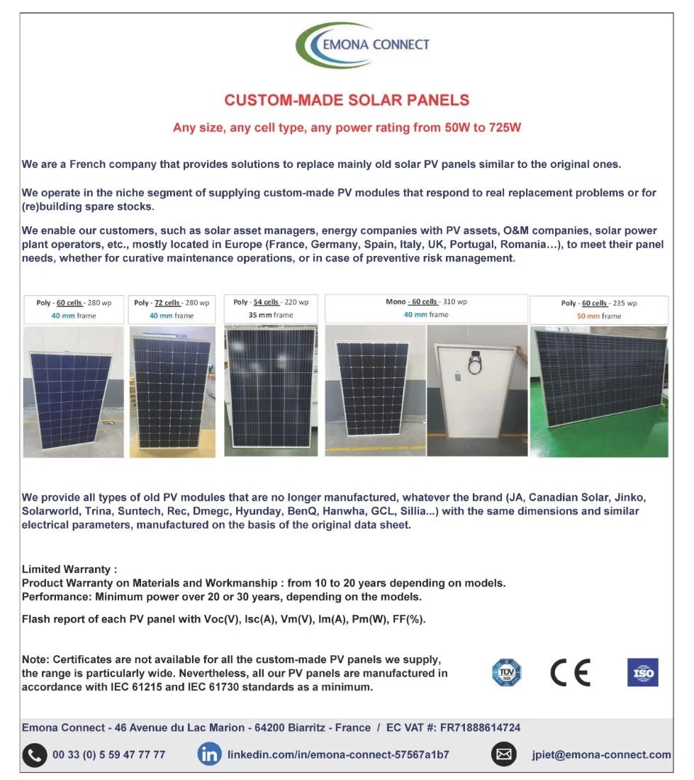 شرکت امونا کانکت (Emona Connect)، یک شرکت فرانسوی مستقر در فرانسه است که به عنوان متخصص در تأمین پنلهای خورشیدی سفارشی برای جایگزینی پنلهای قدیمی فتوولتائیک فعالیت میکند. این شرکت در بخش niche بازار پنلهای جایگزین کار میکند و مشکلاتی مانند عدم دسترسی به مدلهای قدیمی (با توان نامی پایین ۱۸۰–۳۳۰ وات)، افزایش استانداردهای توان بالای ۴۰۰ وات و ناسازگاری ابعاد پنلها با فریمهای موجود را حل میکند. امونا کانکت پنلهایی مشابه پنلهای اصلی قدیمی تولید میکند تا تعمیرات اصلاحی (curative maintenance) یا مدیریت ریسک پیشگیرانه (با ایجاد سهام ایمنی) برای مدیران داراییهای خورشیدی، شرکتهای O&M و اپراتورهای نیروگاهها آسانتر شود.